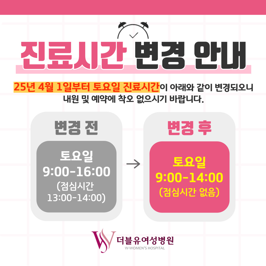 25년 4월 1일부터 토요일 진료시간이 9:00-14:00(점심시간 없음)으로 변경됩니다.